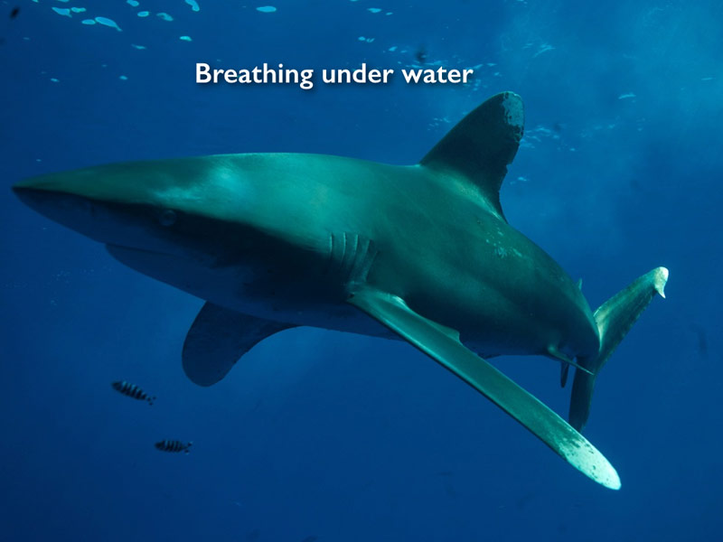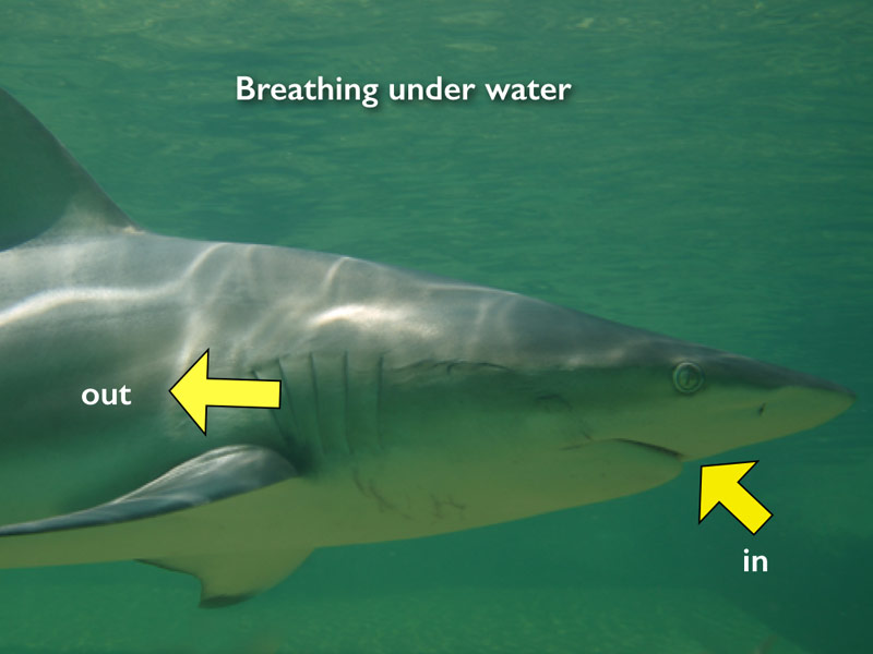 Breathing happens through oxygen absorption when the water flows over the gills. It mostly flows passively through the mouth (in) and the over the gills and slits (out). Picture shown: Blacktip shark.