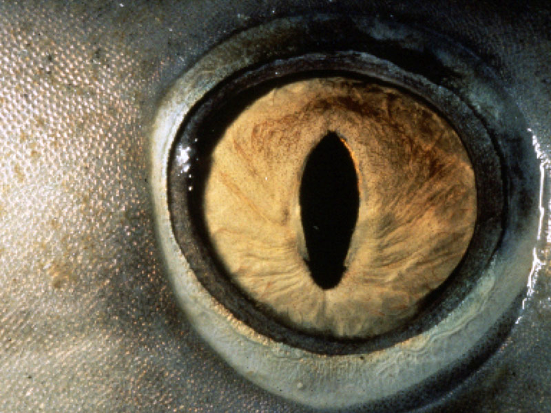 As humans, they have all the common eye colors: blue, brown, green but likewise yellow and silver. Compared to human eyes, sharks can see better than we do in low light due to a special layer in the eye that reflects the incoming light, similar to dogs and cats when caught in some headlights. Picture: Eye of a blacktip shark.